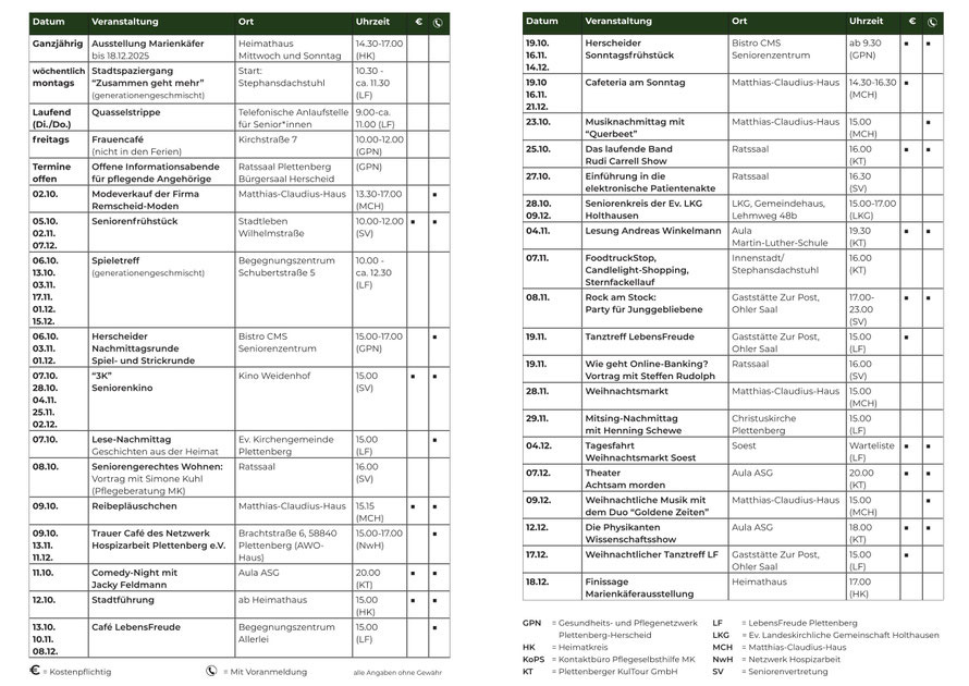 Die Seniorenvertretung Plettenberg und das Team des Kino Weidenhof bieten sowohl am 28.Oktober und 4. November 2025 ab 15.00 Uhr wieder einen gemütlichen Nachmittag mit Kaffee, Kuchen und Kino an. Der Film heißt „Feste und Freunde“.