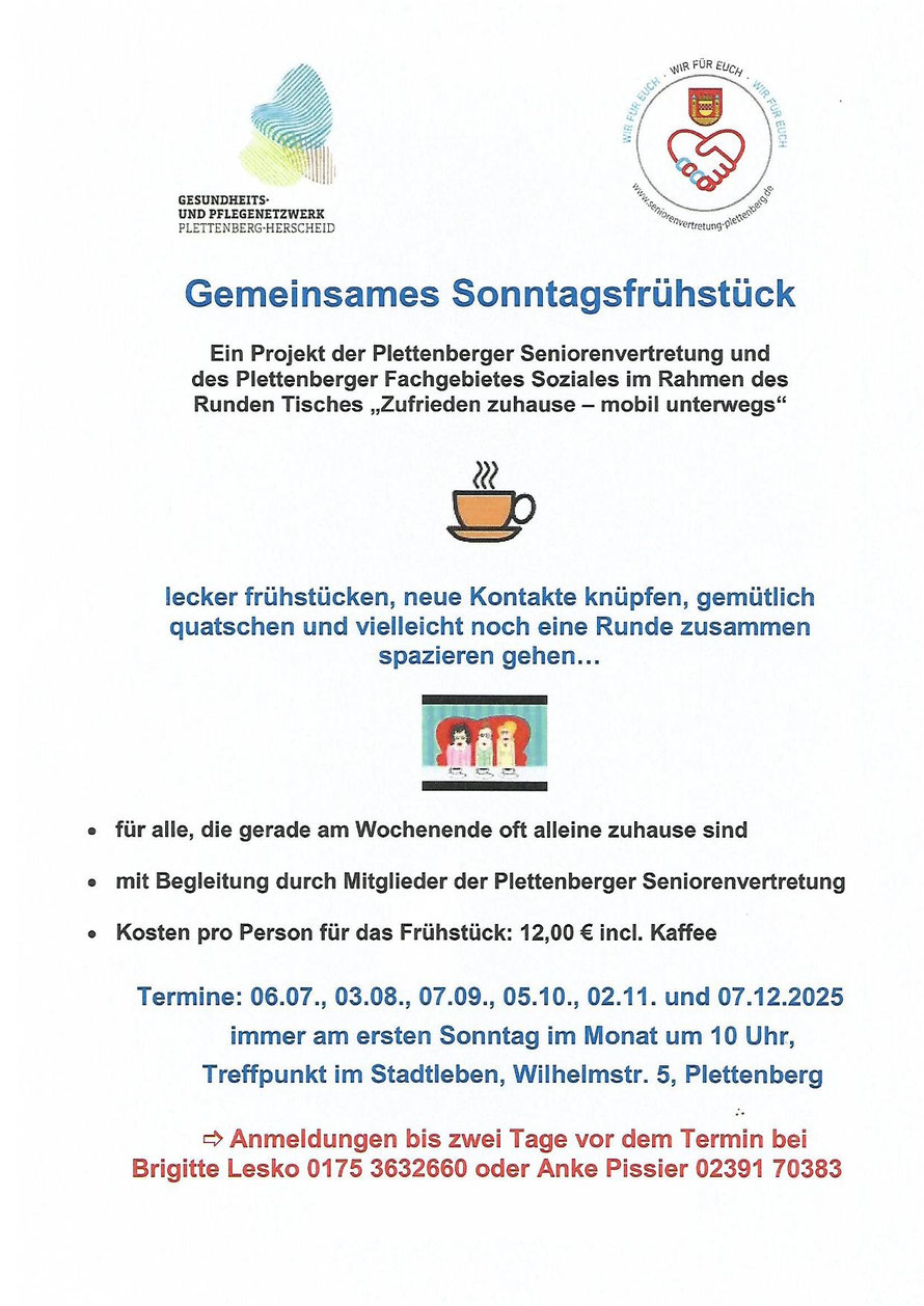 Das nächste Sonntagsfrühstück für Senioren findet am 02. November um 10 Uhr im „Stadtleben“ statt. Die Seniorenvertretung weißt nochmal darauf hin, dass das Seniorenfrühstück nicht nur für alleinstehende Senioren, sondern auch für Paare gedacht ist. Hier ergeben sich nette Gespräche und es können gemeinsame Unternehmungen geplant werden.