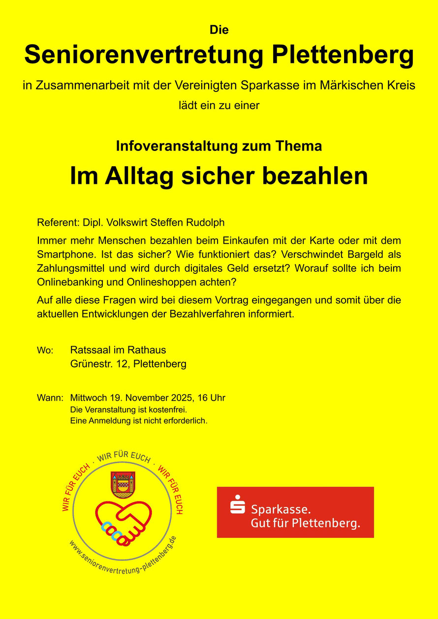 Am 21.Januar 2026 findet im Ratssaal eine Veranstaltung der Seniorenvertretung Plettenberg und dem Hausarztzentrum (HAZ) statt. Auf vielfachem Wunsch wird ein Mitarbeiter in Wort und Bild einen Rundgang durch das HAZ durchführen.